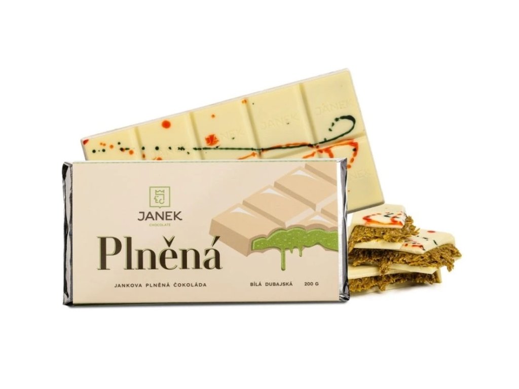 Pořádný kus čokolády ! Více než 2x větší čokoláda, než klasická tabulka. Čokoláda, která uchvátila svět. Dubajská čokoláda od JANKA je lahůdkou, která spojuje luxusní chuť s výjimečným designem. Pistáciový krém, křupavé kadayif a s kapkou tahini. Tato bílá čokoláda je inspirována tradiční recepturou z Dubaje.